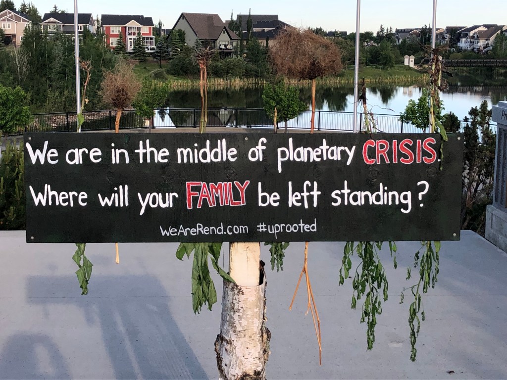 This installation is meant to encourage further reflection on the ways we can improve our relationship with the natural world, while also preparing our families and communities for significant change. The found objects used to create this symbol of uprootedness represents the need to learn how to reuse and salvage materials that our culture often considers disposable.